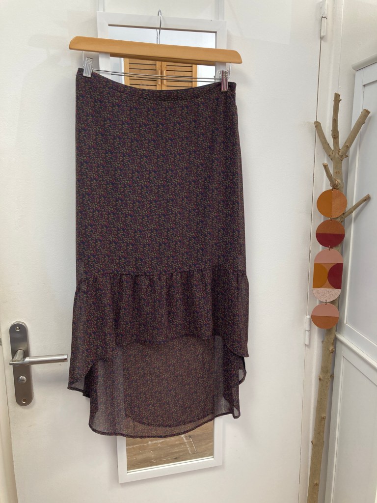 Jupe asymétrique, longueur chevilles à l’arrière et genoux à l’avant