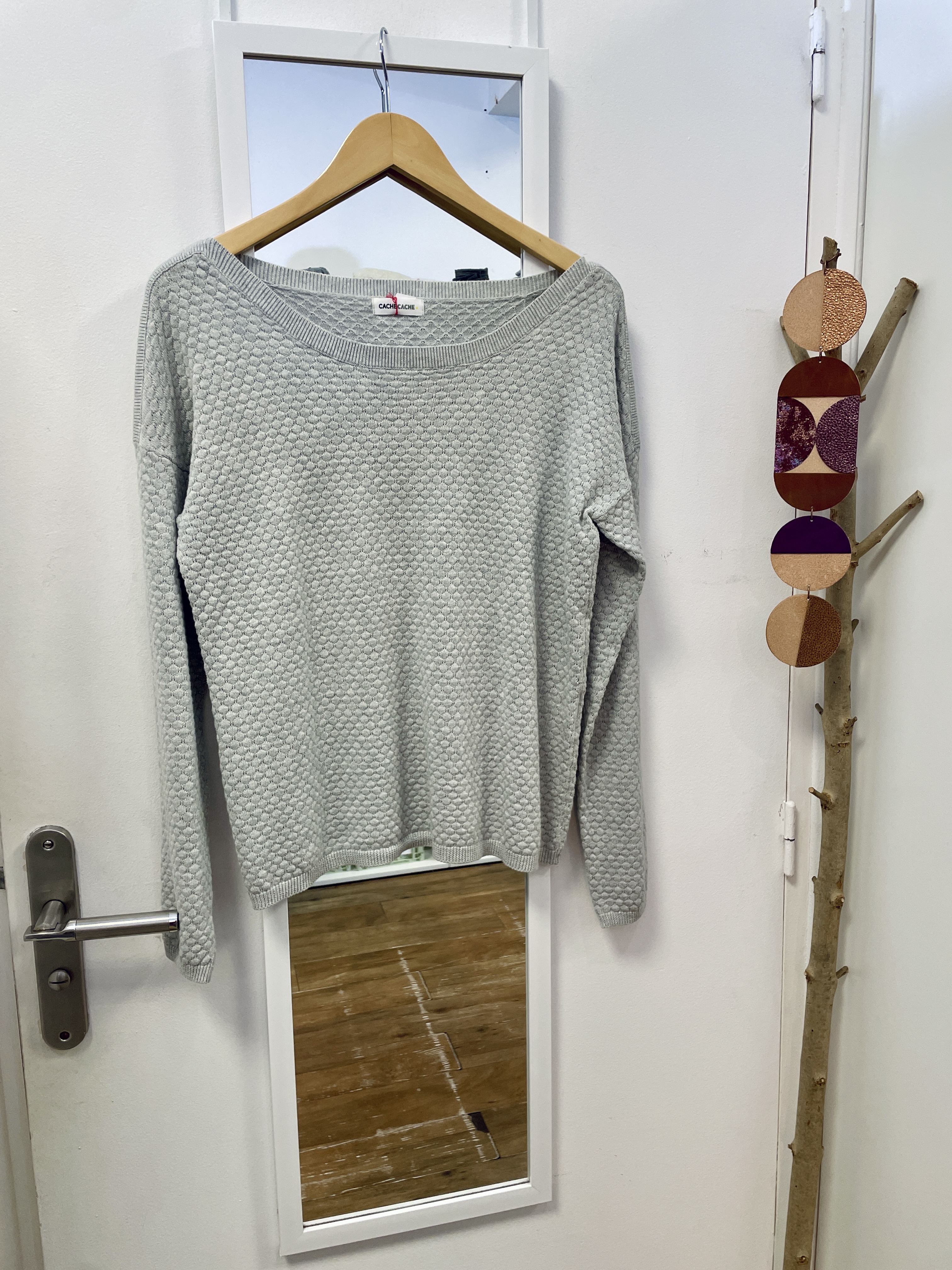 Pull Cache Cache gris matière fine et texturée, col arrondi large et petits boutons aux poignets
