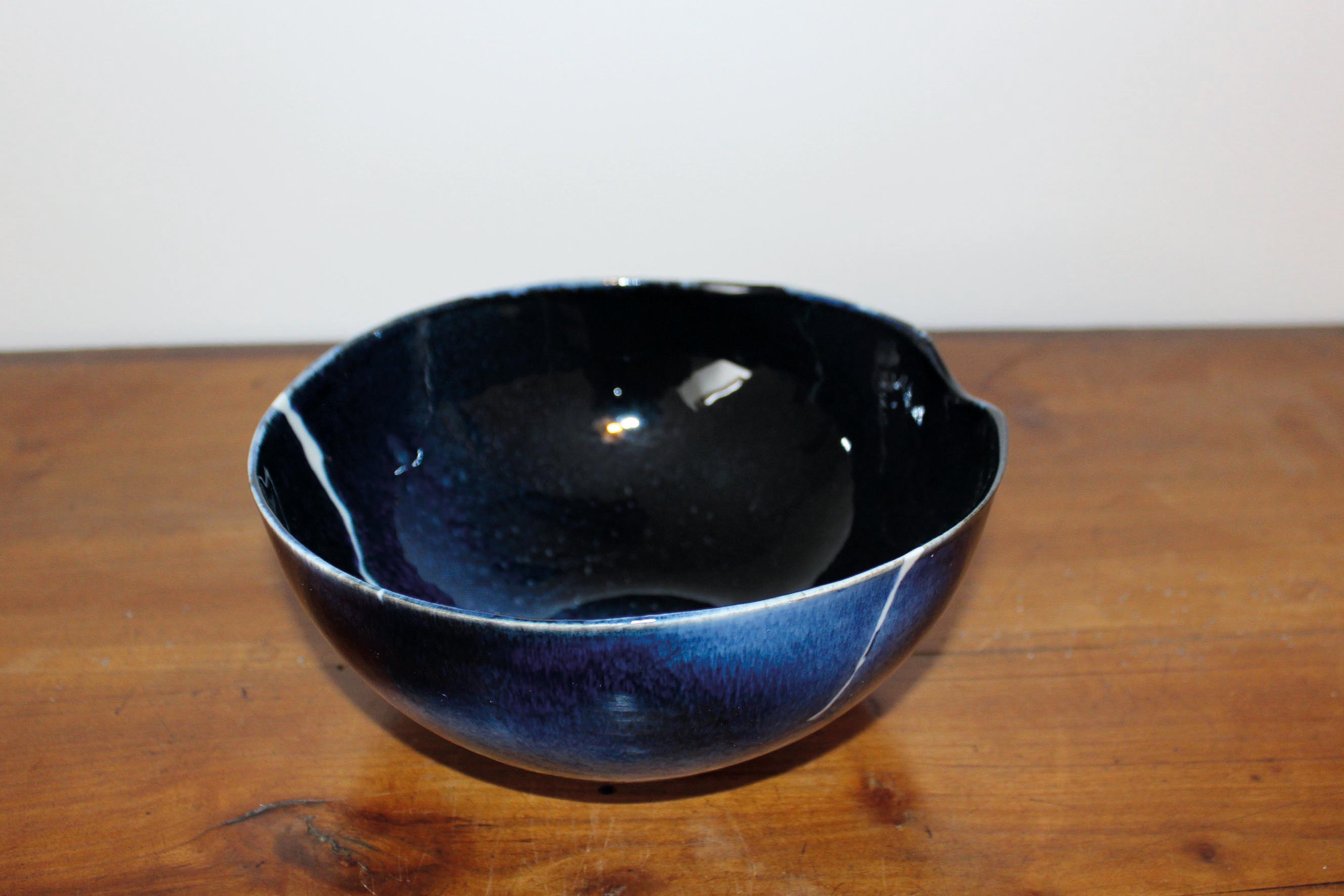 Grand bol en porcelaine, intérieur bleu émaillé et extérieur mat texturé